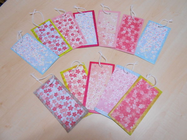 厚紙に、カラフルな折り紙を巻くだけで簡単にできる素敵な、しおりが出来上がりました。